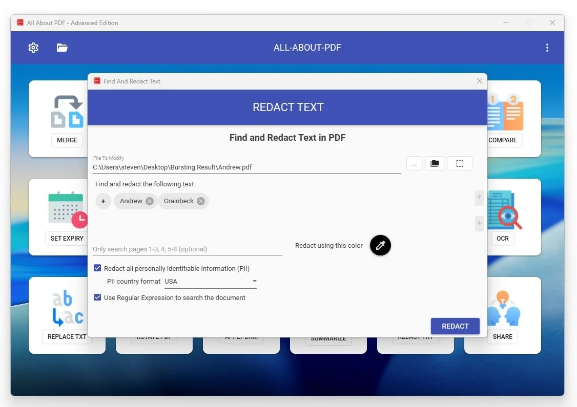 Protect sensitive data faster with All‑About‑PDF’s new “Redact All PII” option. Choose a country format (USA or UK), click Redact, and the app automatically finds and removes personally identifiable information across your PDF.