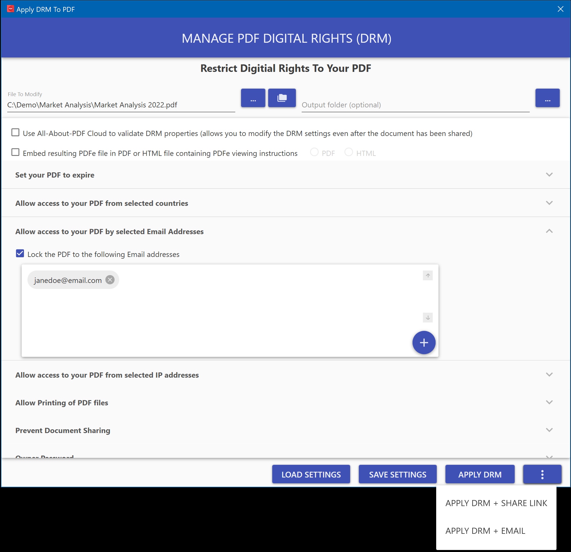Once the email settings have been verified and saved, you can use the "Apply DRM + Email" menu on the DRM protection screen to send the protected document(s) to your recipients via email.